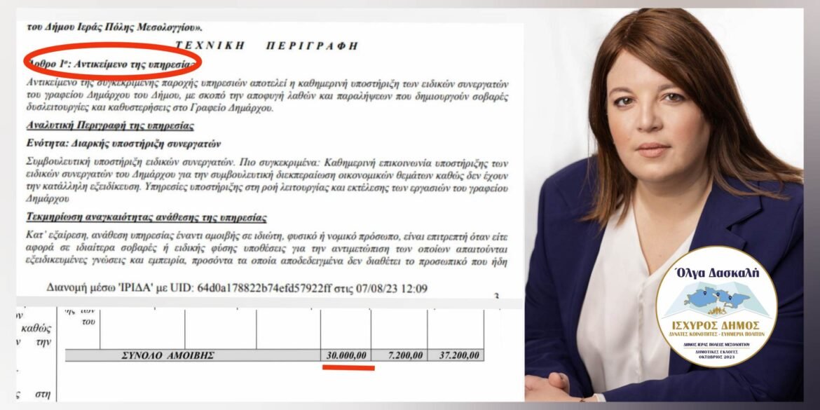 “Συμβουλευτική υποστήριξη ειδικών συνεργατών. Πιο συγκεκριμένα: καθημερινή επικοινωνία υποστήριξης των ειδικών συνεργατών του Δημάρχου για την συμβουλευτική διεκπεραίωση οικονομικών θεμάτων καθώς δεν έχουν την κατάλληλη εξειδίκευση = 37.200,00 ευρώ”