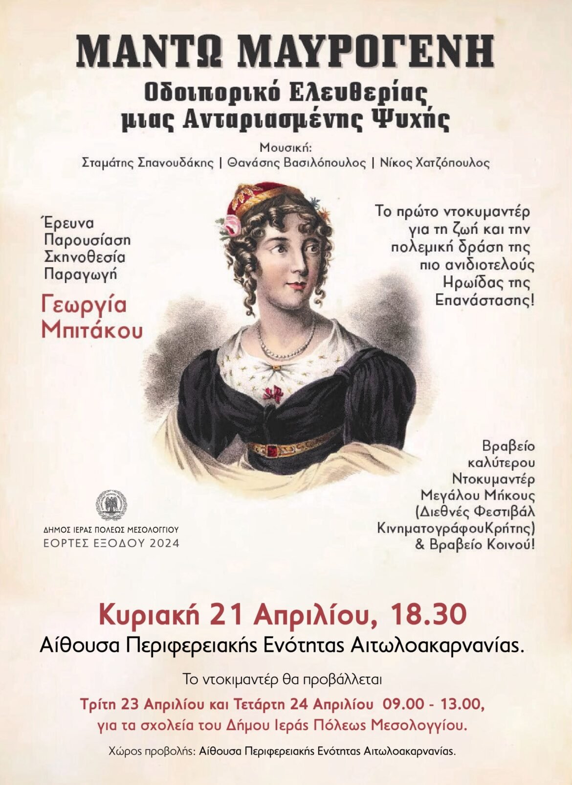Ο Δήμος Ιερής Πόλης Μεσολογγίου σας προσκαλεί στην προβολή του πρώτου ντοκιμαντέρ για τη ζωή και την πολεμική δράση της Μαντώ Μαυρογένη, της πιο ανιδιοτελούς ηρωίδας της Ελληνικής Επανάστασης, την Κυριακή, 21 Απριλίου 2024 στις 18:30στην αίθουσα εκδηλώσεων της Περιφερειακής Ενότητας Αιτωλοακαρνανίας.