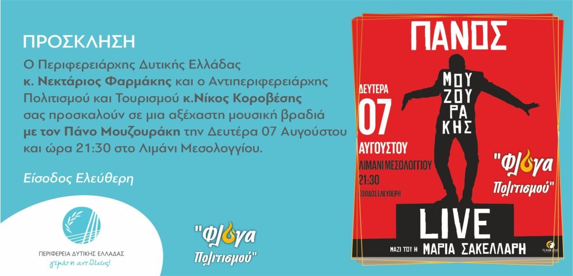 Ο Περιφερειάρχης Δυτικής Ελλάδας κ. Νεκτάριος Φαρμάκης και ο Αντιπεριφερειάρχης Πολιτισμού και Τουρισμού κ. Νικόλαος Κοροβέσης σας προσκαλούν σε μια ξεχωριστή μουσική παράσταση γεμάτη εκπλήξεις με τον Πάνο Μουζουράκη και τη Μαρία Σακελλάρη, η οποία θα πραγματοποιηθεί την Δευτέρα 7 Αυγούστου 2023 και ώρα 21:30 μμ. στο Λιμάνι του Μεσολογγίου.