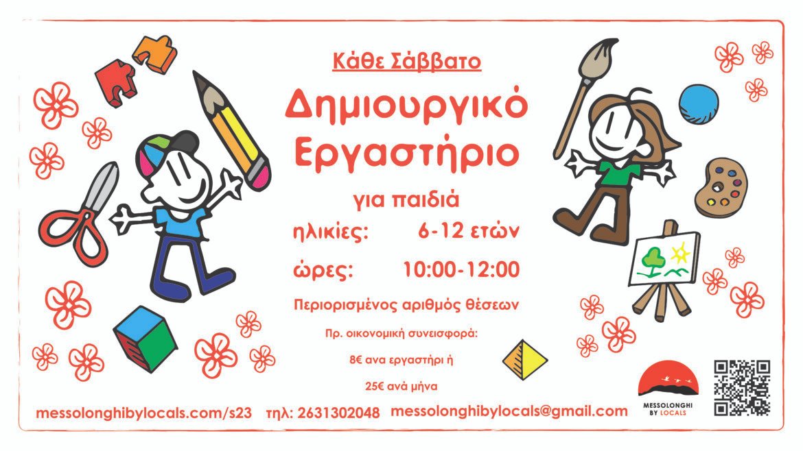 Ξεκινούν τα Δημιουργικά Εργαστήρια στο Messolonghi by Locals, μια σειρά από καλλιτεχνικά εργαστήρια και δραστηριότητες για παιδιά.