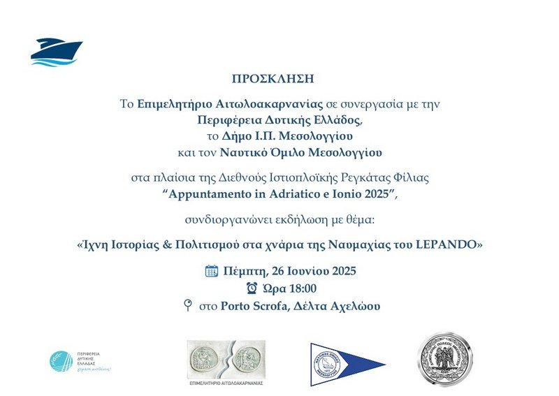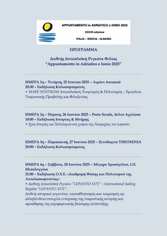 Το Επιμελητήριο Αιτωλοακαρνανίας, σε συνεργασία με την Περιφέρεια Δυτικής Ελλάδας και τον Δήμο Ξηρομέρου, στα πλαίσια της Διεθνούς Ιστιοπλοϊκής Ρεγκάτας Φίλιας “Appuntamento in Adriatico e Ionio 2025 “, συν-διοργανώνει εκδήλωση καλωσορίσματος με θέμα «MARE NOSTRUM» Ιστιοπλοϊκός Τουρισμός & Πολιτισμός – Εργαλεία Τουριστικής Προβολής & Φιλοξενίας