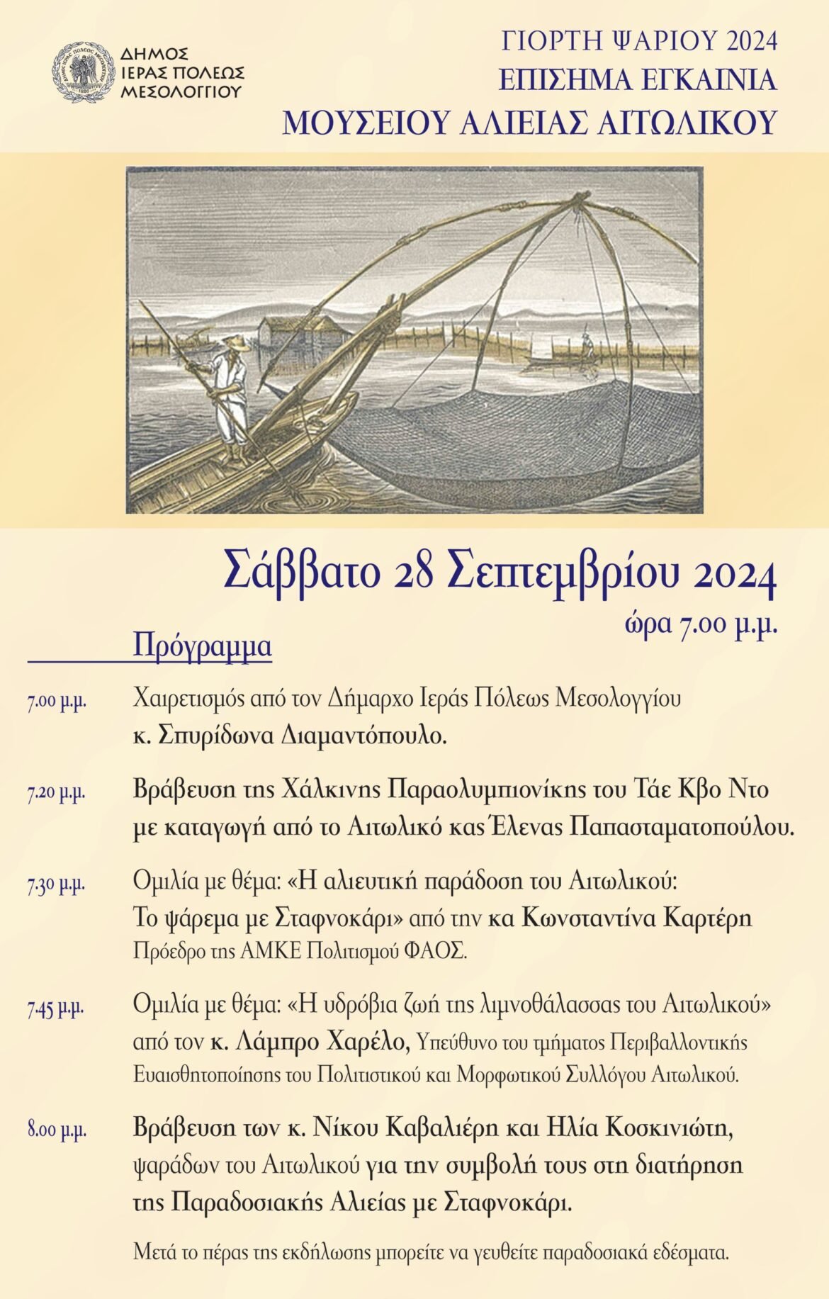 Ο Δήμος Ιερής Πόλης Μεσολογγίου σας προσκαλεί στα επίσημα εγκαίνια του Μουσείου Αλιείας Αιτωλικού το Σάββατο, 28 Σεπτεμβρίου 2024, στις 19:00.