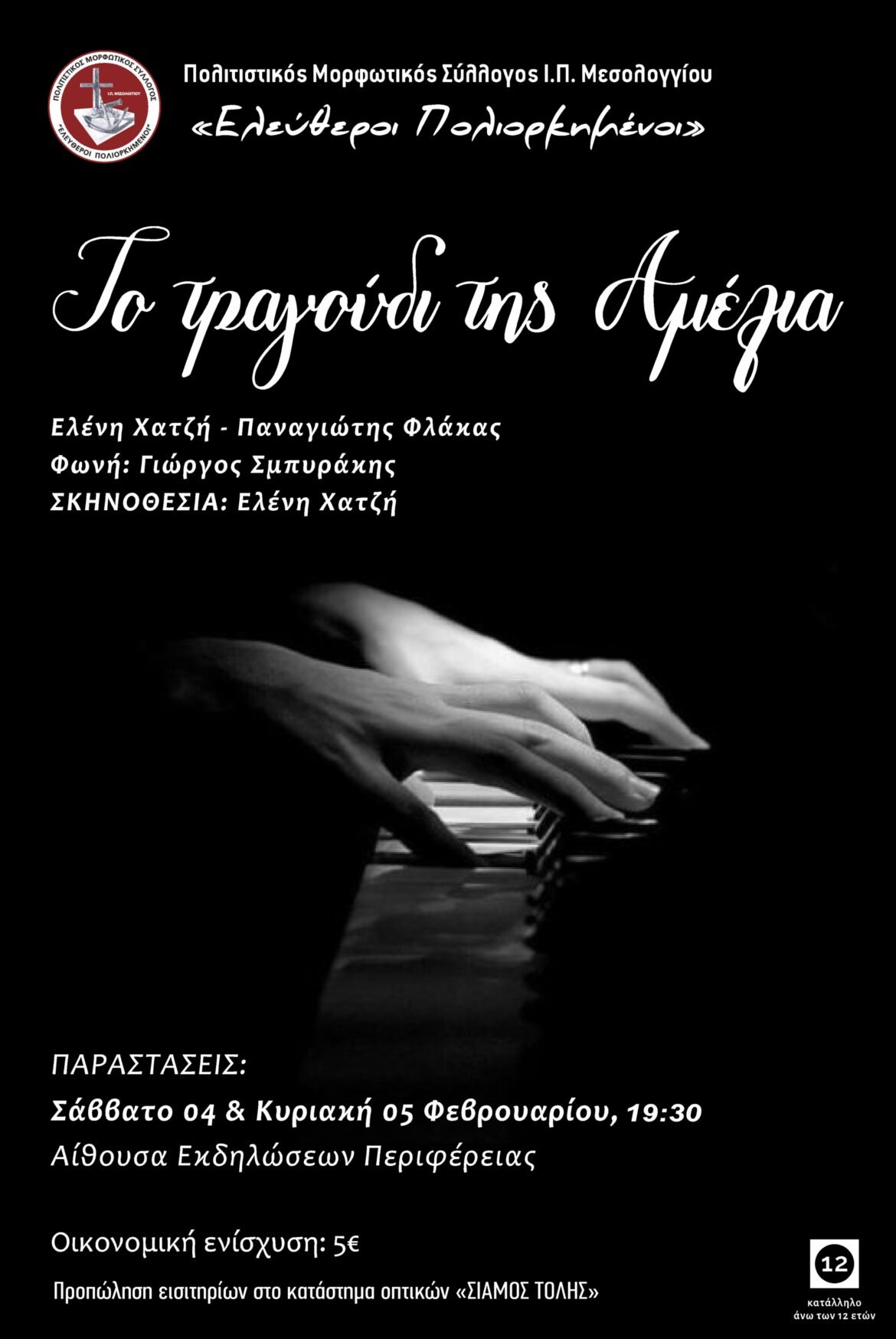 Θα πραγματοποιηθεί άλλη μια ακόμη παράσταση το Σάββατο στις 18 Μαρτίου στις 19.30 ΑΙΘΟΥΣΑ ΕΚΔΗΛΩΣΕΩΝ ΠΕΡΙΦΕΡΕΙΑΣ Ι. Π. ΜΕΣΟΛΟΓΓΙΟΥ