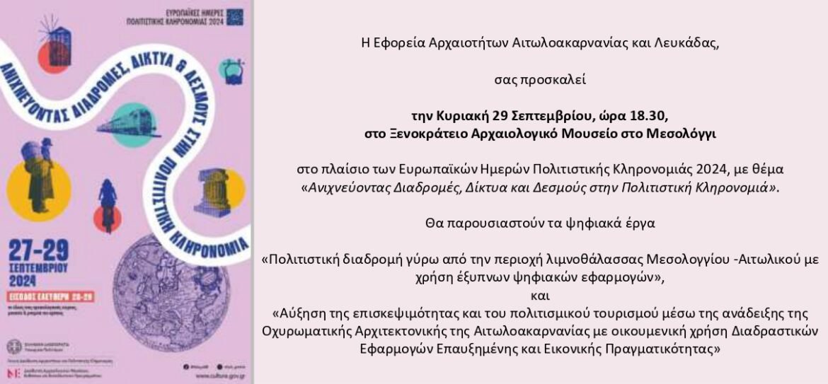 Η Εφορεία Αρχαιοτήτων Αιτωλοακαρνανίας και Λευκάδας, για μία ακόμη χρονιά συμμετέχει στον εορτασμό των “Ευρωπαϊκών Ημερών Πολιτιστικής Κληρονομιάς ”, κοινή δράση του Συμβουλίου της Ευρώπης και της Ευρωπαϊκής Ένωσης, που συντονίζεται από τη Διεύθυνση Αρχαιολογικών Μουσείων, Εκθέσεων και Εκπαιδευτικών Προγραμμάτων του ΥΠ.ΠΟ. Θέμα των φετινών εκδηλώσεων είναι: «Ανιχνεύοντας Διαδρομές, Δίκτυα και Δεσμούς στην Πολιτιστική Κληρονομιά» και θα διαρκέσουν από τις 27 έως 29 Σεπτεμβρίου 2024, με ελεύθερη είσοδο για το κοινό σε όλους τους αρχαιολογικούς χώρους, μνημεία και μουσεία του κράτους το Σάββατο 28 και την Κυριακή 29 Σεπτεμβρίου.