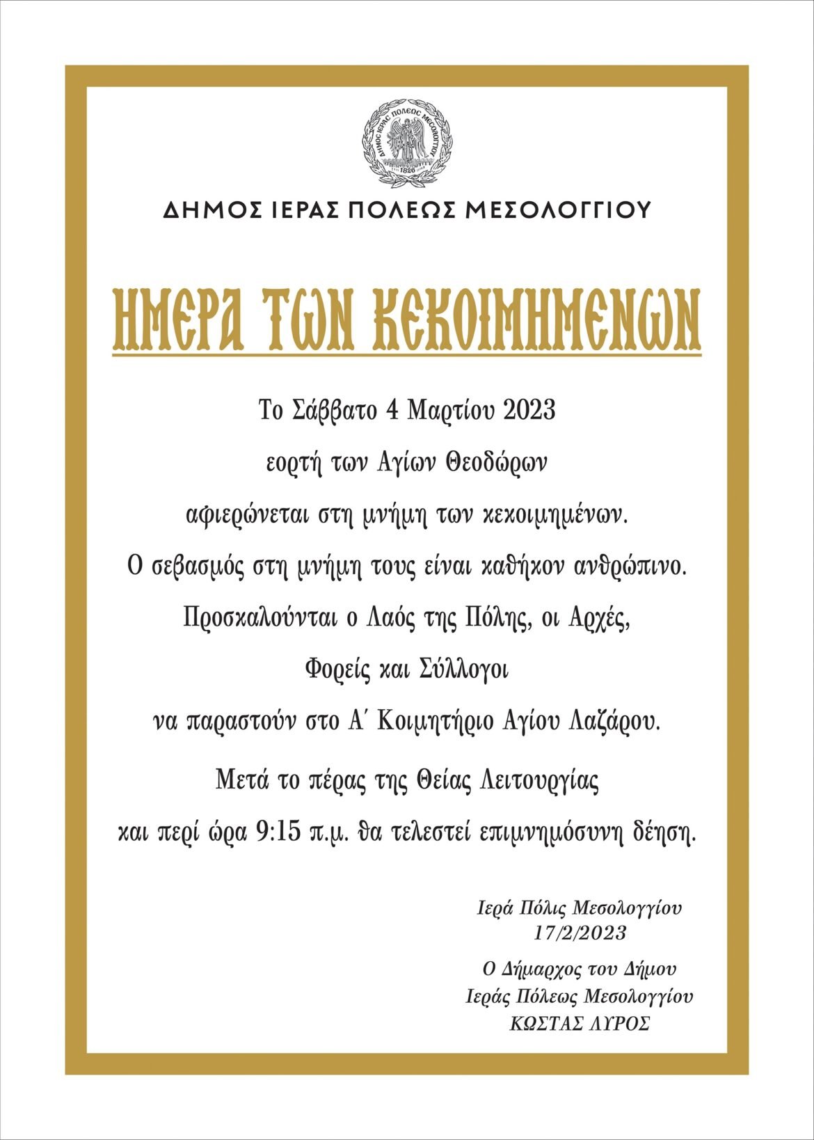 Το Σάββατο 4 Μαρτίου 2023 και ώρα 9:15 π.μ στο Α’ κοιμητήριο Αγίου Λαζάρου στην Ι.Π. Μεσολογγίου θα τελεστεί από το Δήμο, μνημόσυνο υπέρ των κεκοιμημένων.