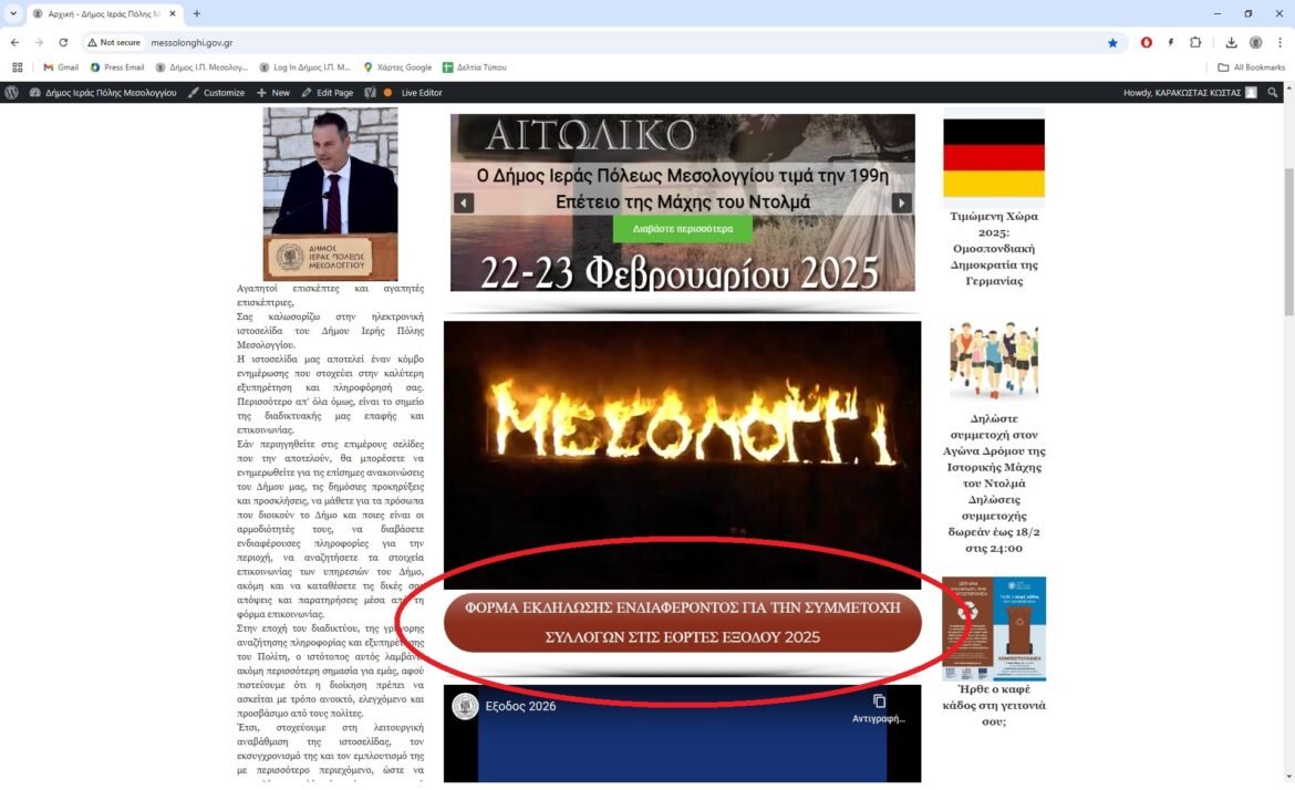 Ο σύνδεσμος ηλεκτρονικής υποβολής αίτησης βρίσκεται στην ιστοσελίδα του Δήμου: http://messolonghi.gov.gr/ επιλέγοντας το μενού «ΦΟΡΜΑ ΕΚΔΗΛΩΣΗΣ ΕΝΔΙΑΦΕΡΟΝΤΟΣ ΓΙΑ ΤΗΝ ΣΥΜΜΕΤΟΧΗ ΣΥΛΟΓΩΝ ΣΤΙΣ ΕΟΡΤΕΣ ΕΞΟΔΟΥ 2025» ή επιλέγοντας απευθείας τον σύνδεσμο: https://docs.google.com/forms/d/e/1FAIpQLSewZ2db2OsX0WfgJOx6ymZnO81lkNqNHIDs53SlgVTv3iFeXA/viewform