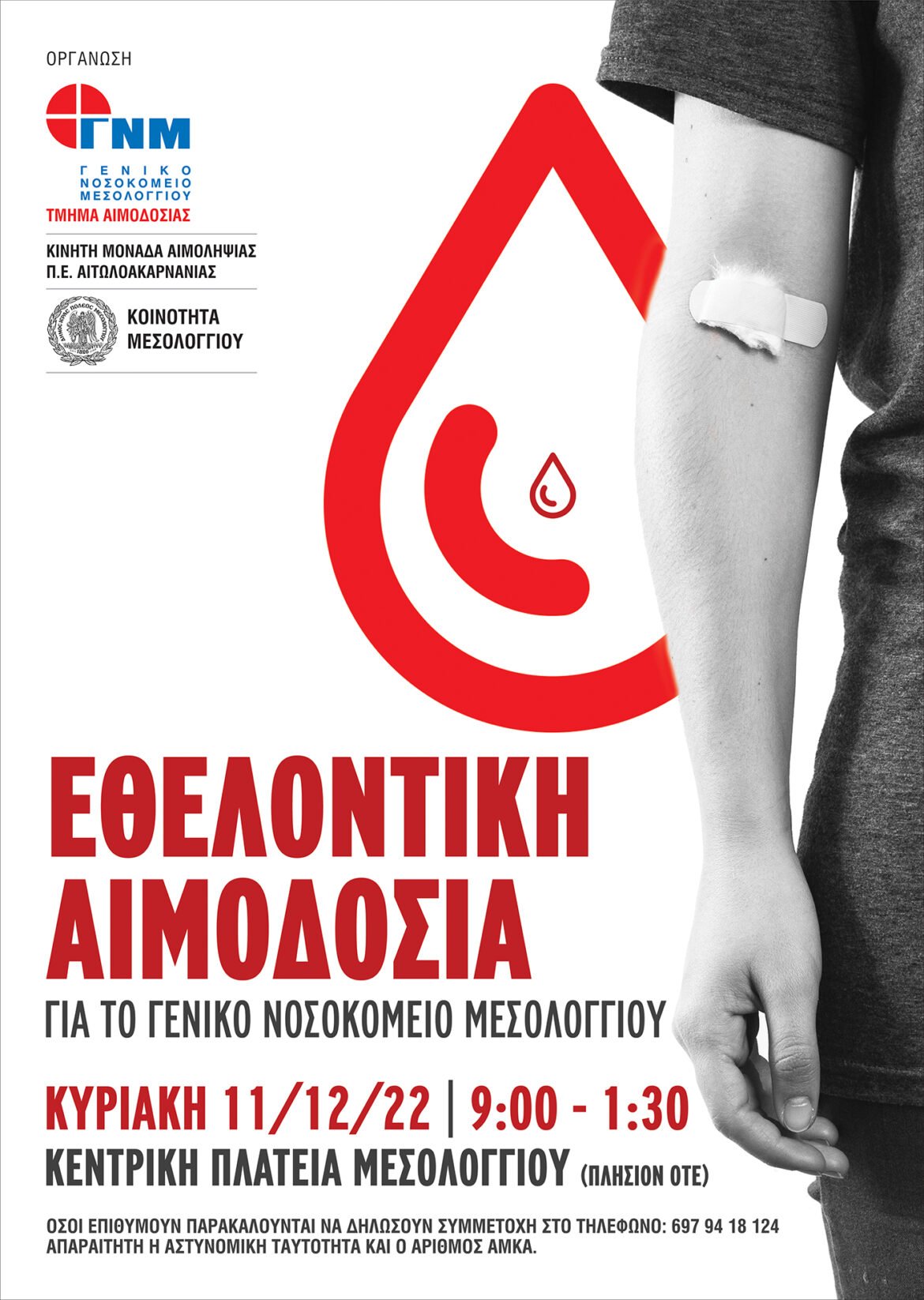 Την Κυριακή 11/12/2022 έλαβε χώρα για άλλη μια φορά με επιτυχία εθελοντική αιμοδοσία στην κεντρική πλατεία Μεσολογγίου (πλησίον ΟΤΕ) για το Γενικό Νοσοκομείο Μεσολογγίου με την κινητή μονάδα της Περιφερειακής Ενότητας Αιτωλοακαρνανίας.