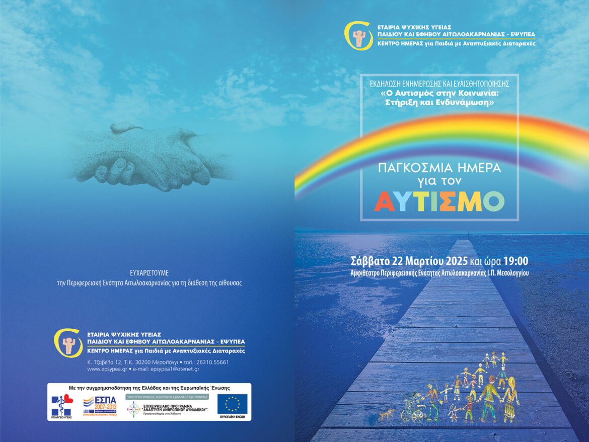 Το Κέντρο Ημέρας για Παιδιά με Αναπτυξιακές Διαταραχές της Εταιρίας Ψυχικής Υγείας Παιδιού και Εφήβου Αιτωλοακαρνανίας-ΕΨΥΠΕΑ, με αφορμή την 2α Απριλίου που έχει καθιερωθεί ως Παγκόσμια Ημέρα Ενημέρωσης για τον Αυτισμό , , σας προσκαλεί το Σάββατο 22 Μαρτίου 2025 και ώρα 19:00, στο Αμφιθέατρο της Περιφερειακής Ενότητας Αιτωλοακαρνανίας στο Μεσολόγγι, σε εκδήλωση ενημέρωσης και ευαισθητοποίησης με τίτλο: