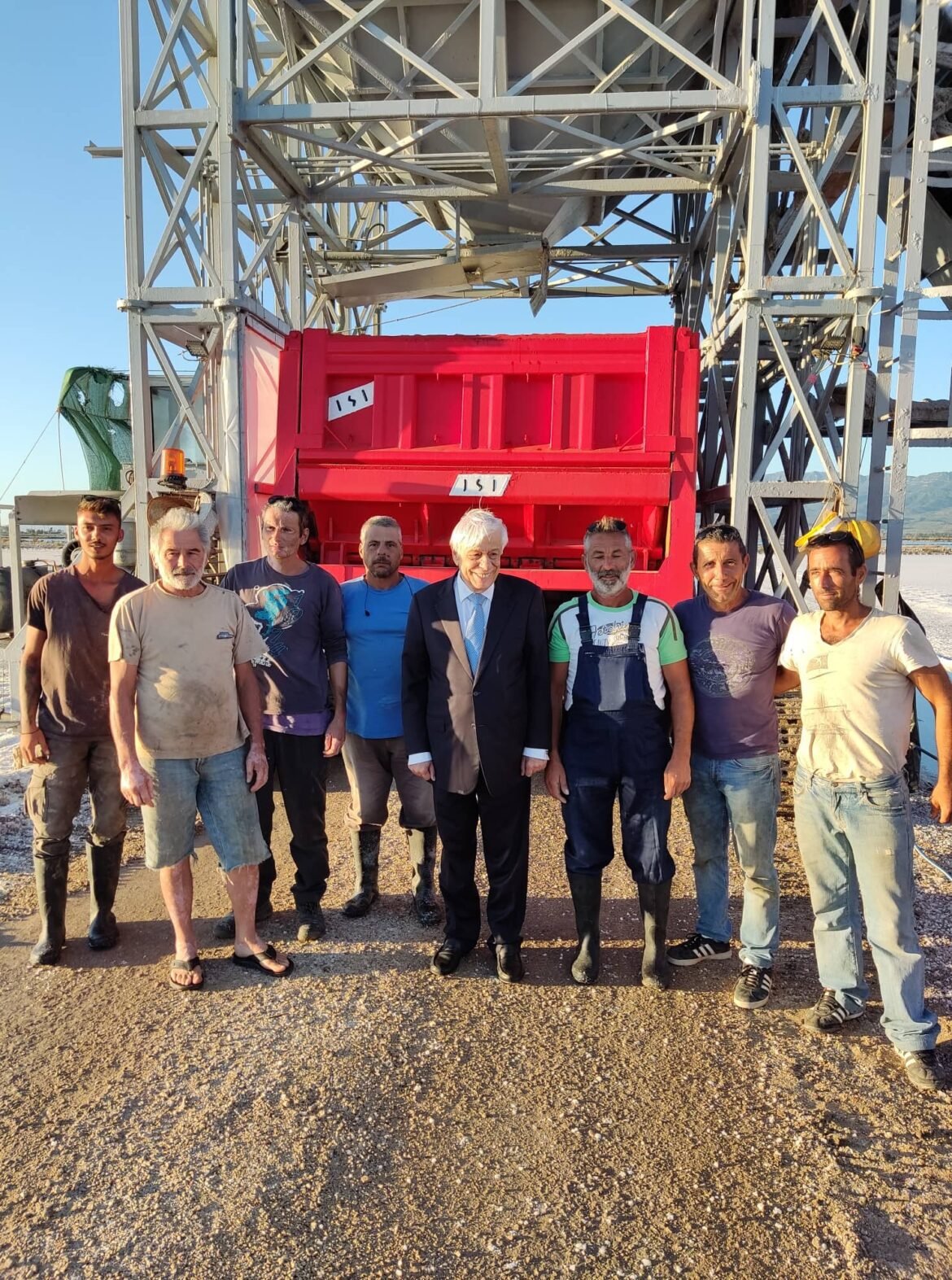 Στο τέλος της επίσκεψης ο πρόεδρος μετέβη στα «τηγάνια» της αλυκής όπου συναντήθηκε με τους αλυκάριους την ώρα που πραγματοποιούσαν εξόρυξη αλατιού και συνομίλησε μαζί τους για τις συνθήκες εργασίας τους και τον τρόπο που καλλιεργούν και συλλέγουν το αλάτι.
