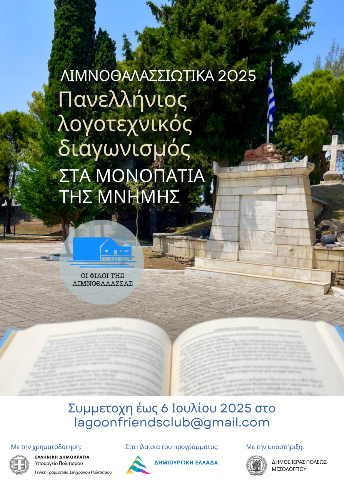 Ο σύλλογος “Οι Φίλοι της Λιμνοθάλασσας” προκηρύσσει τον 2ο Πανελλήνιο Λογοτεχνικό Διαγωνισμό με θέμα “Στα Μονοπάτια της Μνήμης”, στο πλαίσιο των δράσεων φιλαναγνωσίας των εκδηλώσεων Λιμνοθαλασσιώτικα 2025, που θα πραγματοποιηθούν στην Ιερή Πόλη Μεσολογγίου, τη Λιμνοθάλασσα Μεσολογγίου και το νησί του Αιτωλικού, τον Σεπτέμβριο του 2025.