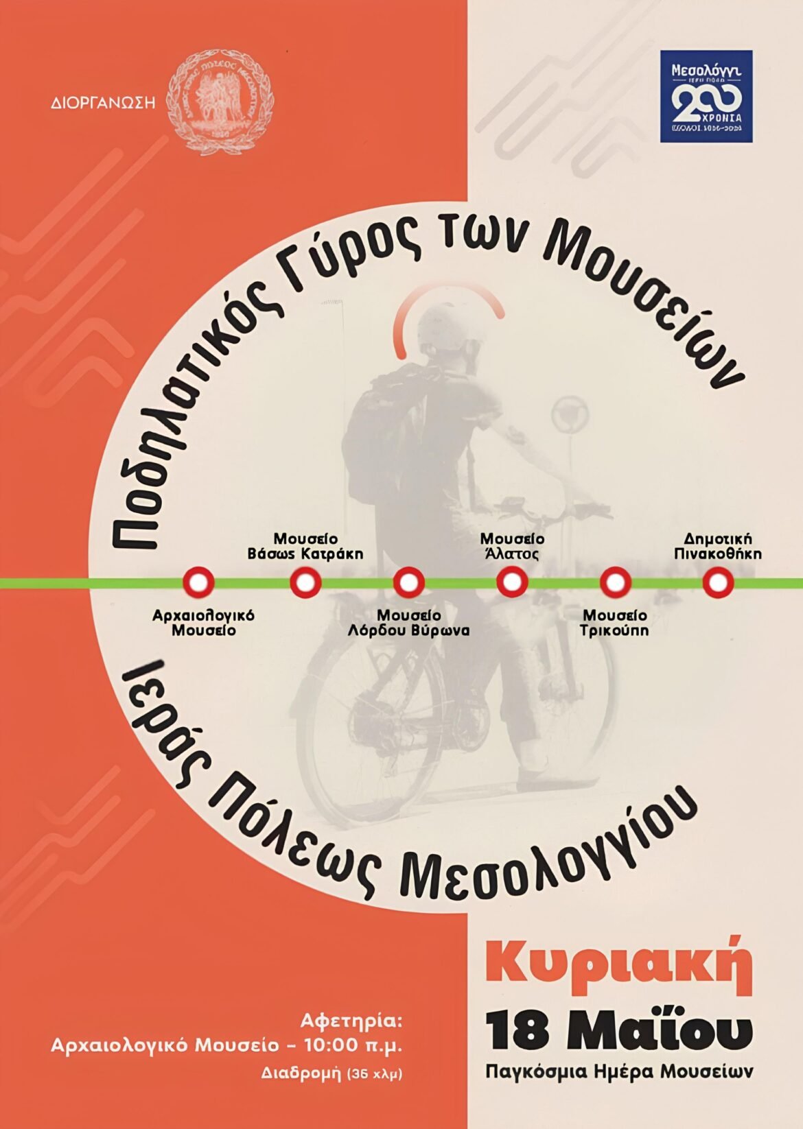 Ο Δήμος Ιεράς Πόλεως Μεσολογγίουδιοργανώνει την Κυριακή, 18 Μαΐου 2025, Παγκόσμια Ημέρα των Μουσείων, τον «Ποδηλατικό γύρο των Μουσείων Ιεράς Πόλεως Μεσολογγίου, στο πλαίσιο της Επετείου του εορτασμού των Διακοσίων Ετών της Εξόδου του Μεσολογγίου το 2026.