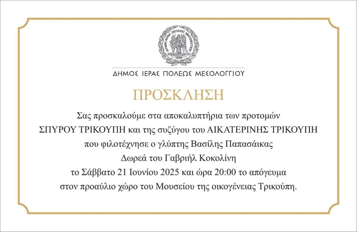 Ο Δήμος Ιερής Πόλης Μεσολογγίου σας προσκαλεί στα αποκαλυπτήρια των προτομών του Μεσολογγίτη πρώτου πρωθυπουργού της Ελλάδας Σπύρου Τρικούπη και της συζύγου του Αικατερίνης Τρικούπη, τις οποίες φιλοτέχνησε ο γλύπτης Βασίλης Παπασάικας και αποτελούν δωρεά του Γαβριήλ Κοκολίνη, το Σάββατο, 21 Ιουνίου 2025 και ώρα 20:00 στον προαύλιο χώρο του Μουσείου Οικογένειας Τρικούπη.