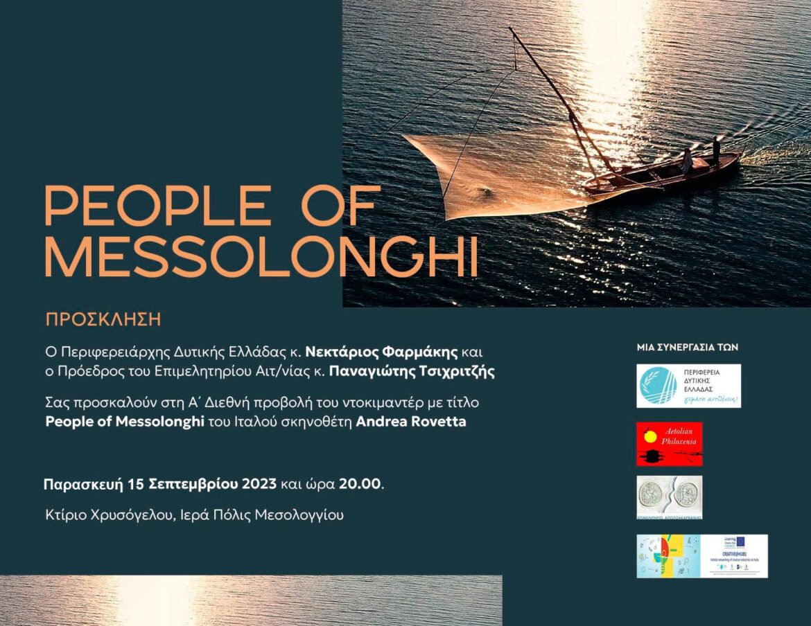 Θα είναι τιμή για τον Ιταλό σκηνοθέτη και την Ι.Π. Μεσολογγίου να παραβρεθούμε στην πρώτη Διεθνή  προβολή του Ντοκιμαντέρ  του Andrea Rovetta, με τίτλο  «PEOPLE OF MESSOLONGHI»  στο κτίριο Χρυσόγελου /Τομέας Πολιτισμού ΠΔΕ, την Παρασκευή  στις 15 Σεπτεμβρίου 2023 και ώρα 20:00, με είσοδο ελεύθερη.