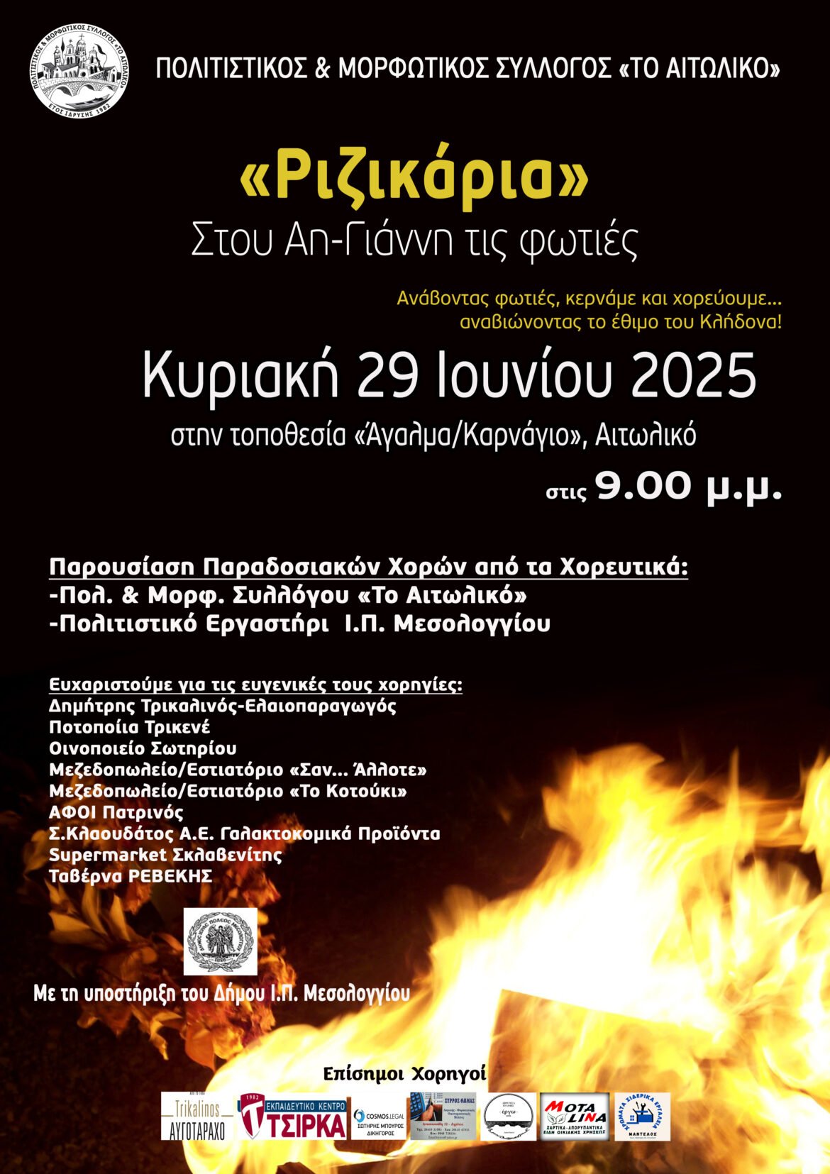 Για 28η χρονιά φέτος το Λαογραφικό Τμήμα του Πολ. & Μορφ. Συλλόγου “Το Αιτωλικό” συντονίζει τον εορτασμό της αναβίωσης του εθίμου του Κλήδονα και σας προσκαλεί στην εκδήλωση: