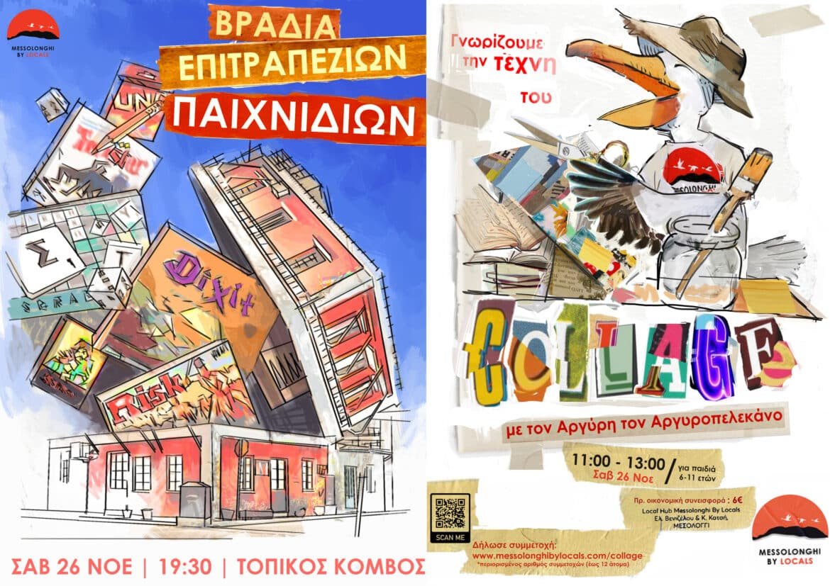 Το Σάββατο, 26.11.2022, ξεκινά δημιουργικά για παιδιά 9-11 ετών με το εργαστήριο “Γνωρίζοντας την τέχνη του κολάζ ταξιδεύουμε στο τοπίο της λιμνοθάλασσας.” Μαζί θα ταξιδέψουμε στην λιμνοθάλασσα, θα οραματιστούμε το τοπίο της και θα φανταστούμε όλες τις μικρές ή μεγάλες ιστορίες που διαδραματίζονται στα ήρεμα νερά της. Στην συνέχεια θα μεταφέρουμε τις ιδέες μας στο χαρτί χρησιμοποιώντας την τεχνική του κολάζ και θα δημιουργήσουμε ένα ομαδικό έργο με πρωταγωνιστή τον Αργύρη τον αργυροπελεκάνο. Το εργαστήριο απευθύνεται σε παιδιά ηλικίας 6-11.Διάρκεια: 09:00-11:00 Υπάρχουν περιορισμένες θέσεις. Θα τηρηθεί σειρά προτεραιότητας Για να κλείσετε θέση συμπληρώστε την φόρμα: https://messolonghibylocals.com/collage/ Η μέρα συνεχίζεται με την Βραδιά επιτραπέζιων στις 19:30. Τώρα που ήρθε ο χειμώνας (έστω και αργοπορημένα) ο καιρός είναι ιδανικός για μια βραδιά γεμάτη με φίλους και καινούργιες γνωριμίες παίζοντας επιτραπέζια παιχνίδια. Το βράδυ του Σαββάτου στις 19:30 ελάτε με τους φίλους σας να γνωριστούμε και να παίξουμε παρέα ένα από τα επιτραπέζια της ντουλάπας επιτραπέζιων του τοπικού κόμβου. Παράλληλα μπορείτε να περιηγηθείτε στην έκθεση γελοιογραφίας του Μιχάλη Κουντούρη που φιλοξενείται στον #ΤοπικόΚόμβο_LocalHUB μέχρι τέλος Νοεμβρίου.