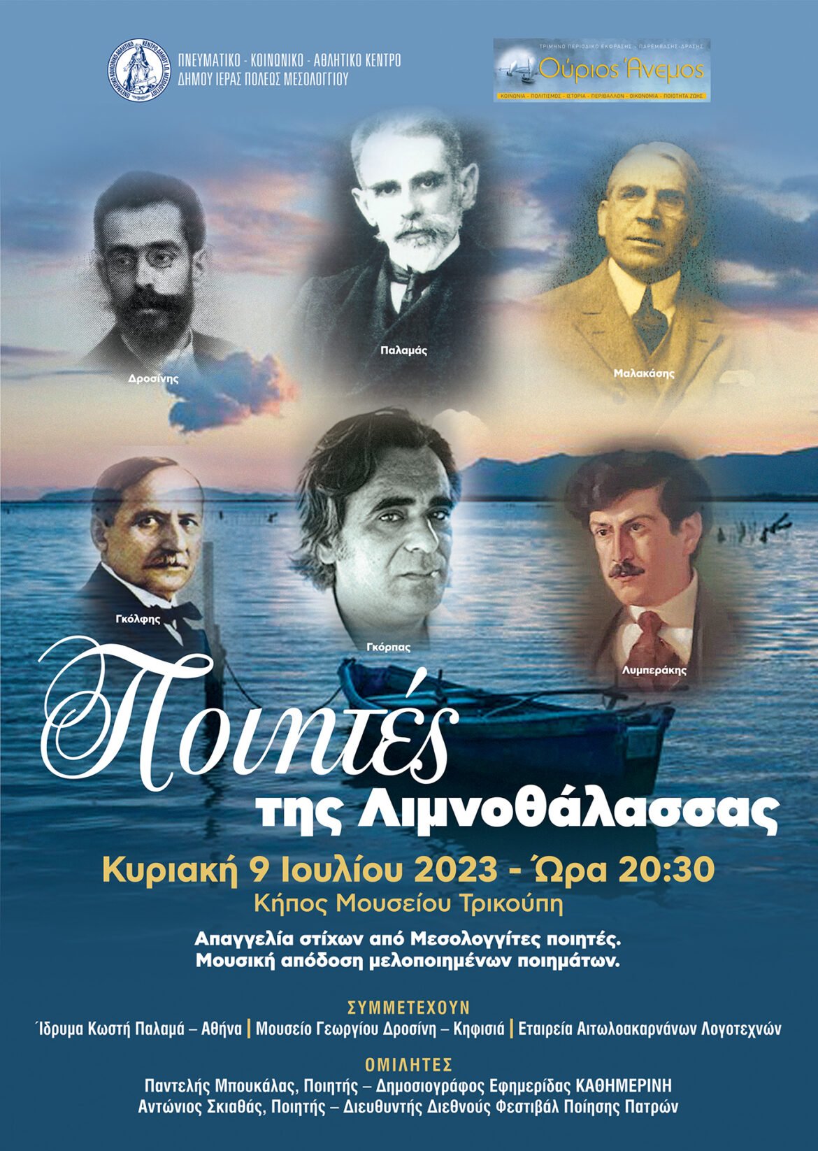 Την Κυριακή 9 Ιουλίου 2023 και ώρα 20:30 στον Κήπο Μουσείου Σπυρίδωνος και Χαριλάου Τρικούπη μέσα στην καλοκαιρινή νυχτιά θα λάβει χώρα μια μαγική εκδήλωση με Απαγγελία στίχων ΜεσολογγιτώνΠοιητών, Μουσική απόδοση μελοποιημένων ποιημάτωνκαι έκθεσηποιητικώνσυλλογώνμε τίτλο «Ποιητές της Λιμνοθάλασσας».