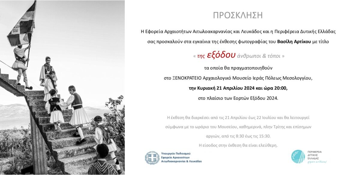 Η Εφορεία Αρχαιοτήτων Αιτωλοακαρνανίας και Λευκάδας, σε συνεργασία με την Περιφέρεια Δυτικής Ελλάδας, διοργανώνει την περιοδική έκθεση φωτογραφίας του Βασίλη Αρτίκου με θέμα «Της Εξόδου… Άνθρωποι και Τόποι», η οποία θα παρουσιαστεί στο Ξενοκράτειο Αρχαιολογικό Μουσείο στο Μεσολόγγι.