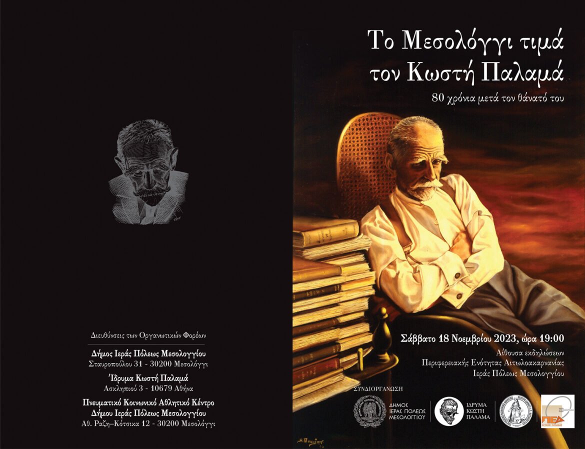 Το Σάββατο 18 Νοεμβρίου 2023 στην Αίθουσα Εκδηλώσεων Π.Ε. Αιτωλοακαρνανίας στην Ι.Π. Μεσολογγίου και ώρα 19:00 θα λάβει χώρα η επετειακή εκδήλωση «Το Μεσολόγγι τιμά τον Κωστή Παλαμά» επ’ αφορμή της συμπλήρωσης 80 ετών από το θάνατο του σπουδαίου ποιητή.