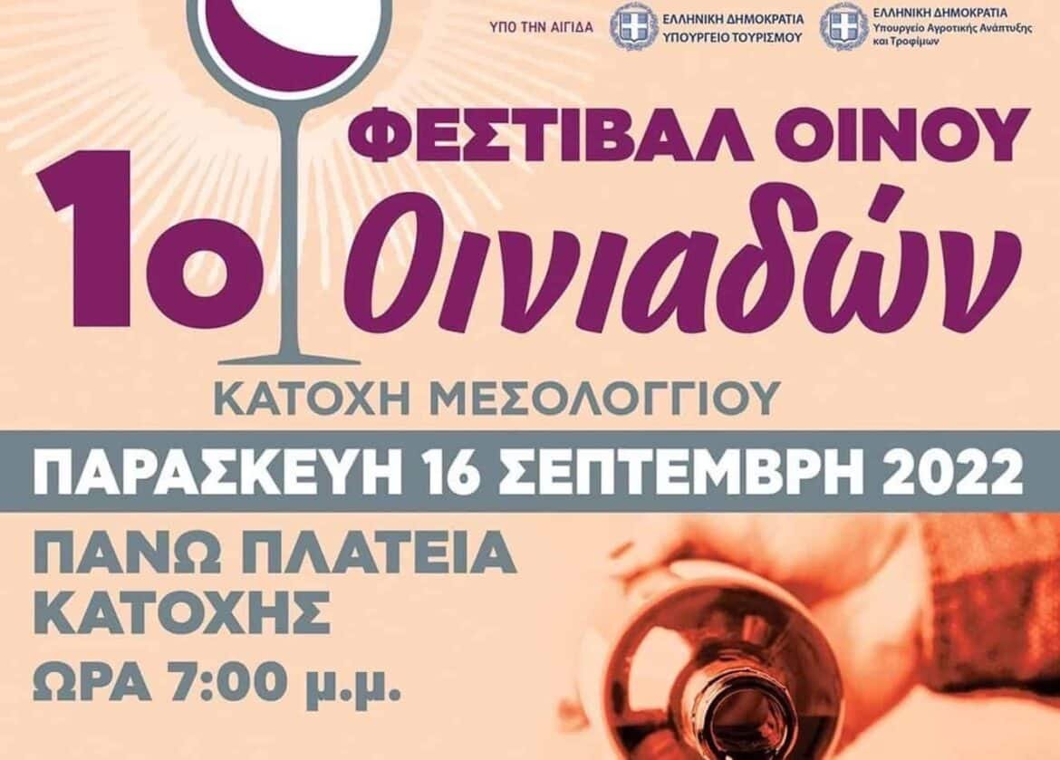 Ο Δήμος Ι.Π. Μεσολογγίου σας προσκαλεί και σας περιμένει στην όμορφη Κατοχή της Δ.Ε Οινιαδών να απολαύσετε ντόπιες ποικιλίες όπως η Μαλαγουζιά, το Μαυρούδι Οινιαδών, το Αυγουστολίδη ή Γουστολίδη και η Μαυροδάφνη όπου ντόπιοι παραγωγοί θα σας καλέσουν να τα δοκιμάσετε και μετά όλοι μαζί να γιορτάσουμε την παραγωγή μας συνοδεία μουσικής. Στην εκδήλωση θα παραβρίσκεται και γευσιγνώστης προκειμένου να δοκιμάσει και να αξιολογήσει χαρακτηριστικά των ποικιλιών και να «μυήσει» το κοινό στο γευστικό κόσμο του κρασιού.