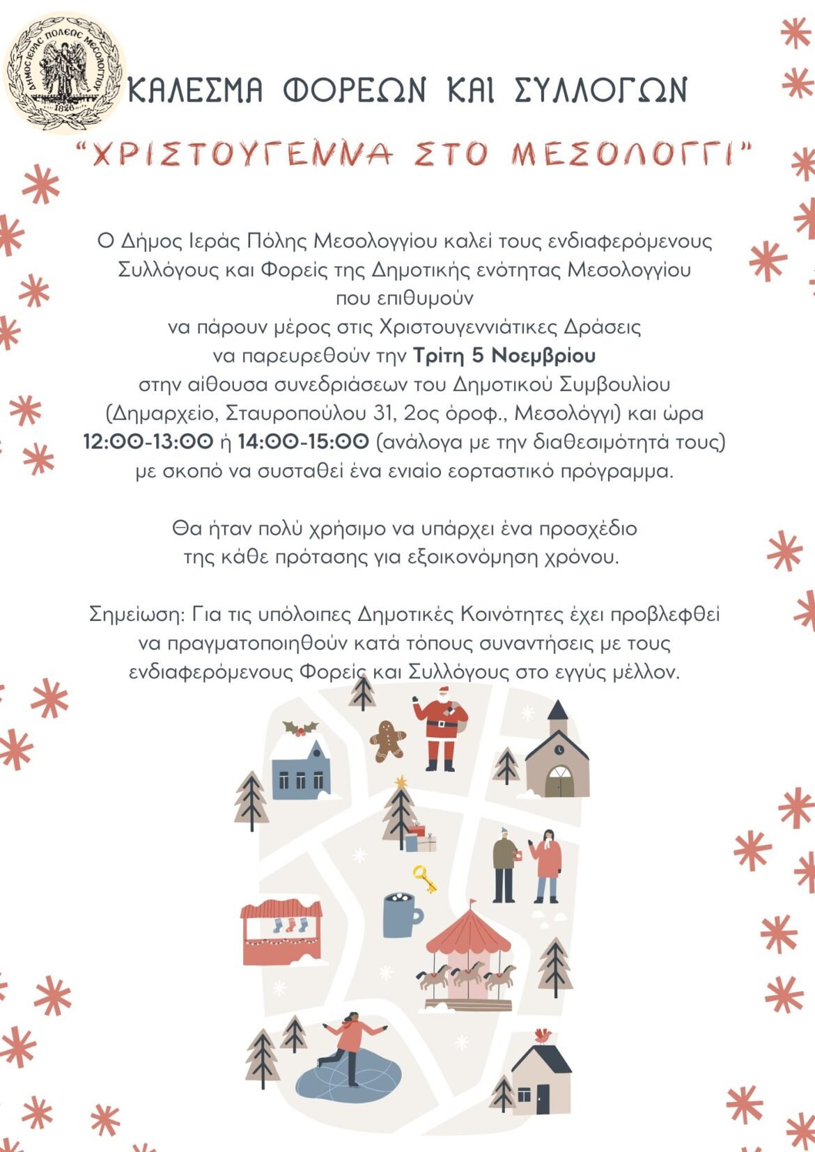Ο Δήμος Ιερής Πόλης Μεσολογγίου καλεί τους ενδιαφερόμενους Συλλόγους και Φορείς της Δημοτικής Ενότητας Μεσολογγίου που επιθυμούν να πάρουν μέρος στις Χριστουγεννιάτικες Δράσεις να παρευρεθούν την Τρίτη 5 Νοεμβρίου2024 στην αίθουσα συνεδριάσεων του Δημοτικού Συμβουλίου (Δημαρχείο, Σταυροπούλου 31, 2ος όροφ., Μεσολόγγι) και ώρα 12:00-13:00 ή 14:00-15:00 (ανάλογα με την διαθεσιμότητά τους) με σκοπό να συσταθεί ένα ενιαίο εορταστικό πρόγραμμα.